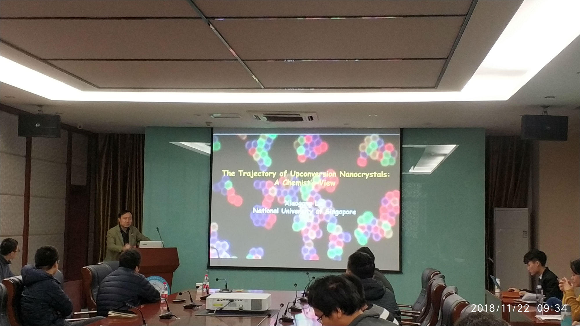 纳米技术是当前科学研究的热门领域之一,纳米材料所具有的特殊光学、催化等性质正在酝酿一场技术革命。11月22日,应王殳凹教授邀请,国际纳米领域知名教授刘小刚到我中心进行学术交流。刘小刚教授现供职于新加坡国立大学,在纳米材料的荧光性能开发上取得了很多出色的成果。刘教授在我中心交流期间,向中心师生们介绍了他们在上转换荧光材料中取得的一系列成果,作了题为“The Trajectory of Upconversion Nanocrystals: A Chemists View”的报告。在座师生们在报告结束后向刘老师请教了上转换材料的相关问题,就我中心与之相关的研究方向进行了深入探讨,打开了合作的契机。