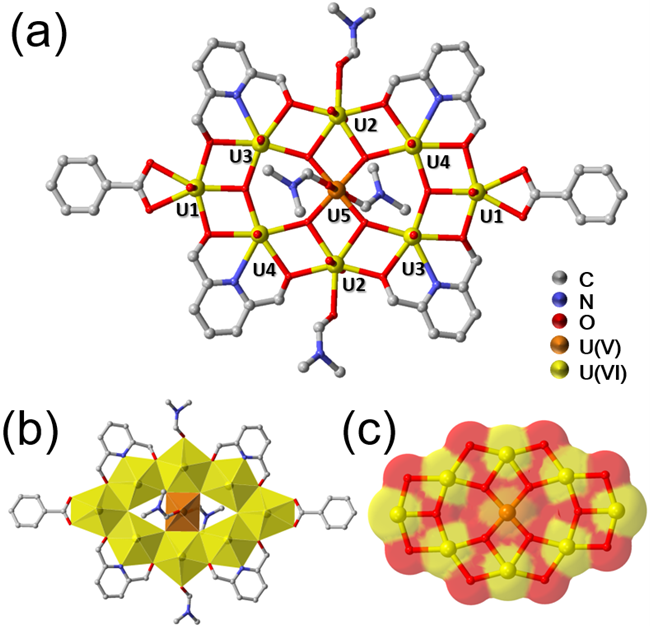 研究人员采用常规溶剂热法,以硝酸铀酰、有机硼酸酯和苯甲酸为原料,通过原位还原获得了一种新的V/VI混合价态铀簇(1),该化合物是目前最大的基于“tetraoxo核”的混价铀簇。单晶衍射数据显示化合物1为九核簇,其中包括一个U(V)和八个U(VI)。U(V)为六配位模式,平面有四个μ3-O原子、轴向为两个DMF分子提供的O原子,为典型的“tetraoxo核”;其余八个U(VI)为平面五配位、两个轴向铀酰氧的五角双锥构型。