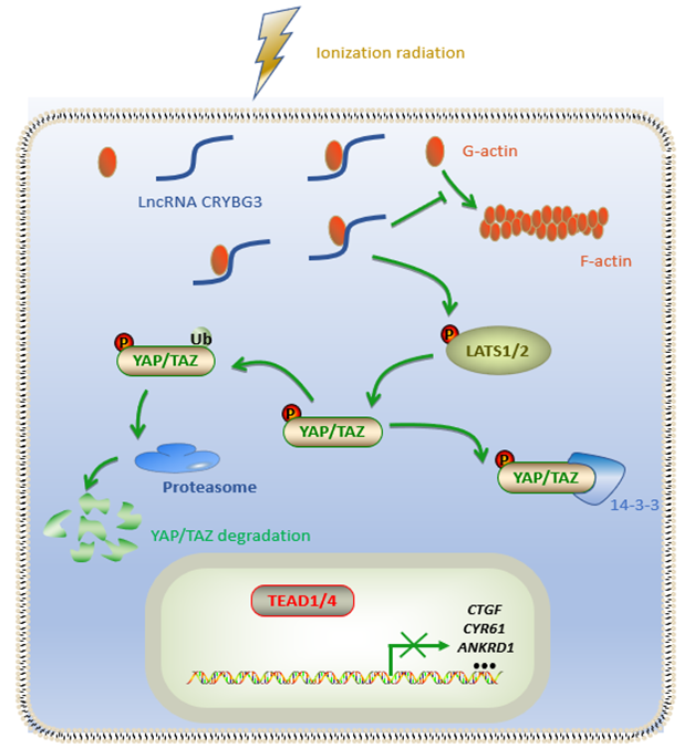 放射医学中心周光明课题组和畅磊教授课题组最新成果以”Ionizing radiation-induced long noncoding RNA CRYBG3 regulates YAP/TAZ through mechanotransduction”为题发表在《Cell Death & Disease》杂志。论文链接:https://www.nature.com/articles/s41419-022-04650-x。该文章发现长链非编码RNA CRYBG3能够调控肌动蛋白细胞骨架的组装,促进LATS1/2磷酸化,导致YAP/TAZ的转录活性受限,从而调节肿瘤的增殖和侵袭转移。该文章创新性的将辐射生物效应与当前研究的前沿领域-生物力学传导结合起来。为辐射治癌的有效性提供新的理论依据,并可能为肿瘤的临床治疗提供新的靶点。