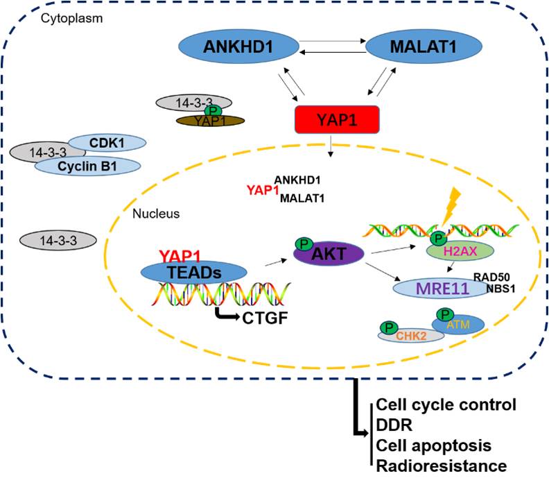 曹建平教授在国家自然科学基金的支持下,与苏州大学附属第二医院邢春根教授合作,基础研究联合临床。深度研究了结直肠癌促进蛋白ANKHD1和长链非编码RNA(lncRNA MALAT1)的作用关系以及其对结直肠癌放射敏感性的影响。实验结果表明,结直肠癌中ANKHD1和lncRNA MALAT1的高表达可显著诱导放疗抵抗。在机制上,ANKHD1、lncRNA MALAT1和YAP1相互作用而形成正向反馈回路,在此回路中ANKHD1和lncRNA MALAT1通过靶向调节YAP1的转录活性而促进PI3K/AKT信号的激活,进而抑制电离辐射后结直肠癌细胞直接(DSBs)和间接(ROS)DNA损伤,并促进电离辐射后DNA损伤修复而诱导放疗抵抗。