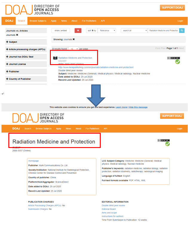 苏州大学放射医学与辐射防护国家重点实验室、中国疾病预防控制中心辐射防护与核安全医学所共同主办的“Radiation Medicine and Protection”英文刊 通过全球最具影响力的开放存取期刊目录( Directory of Open Access Journals ,DOAJ)评估后,于2020年7月29日被DOAJ数据库正式收录。(查询地址:https://doaj.org/)